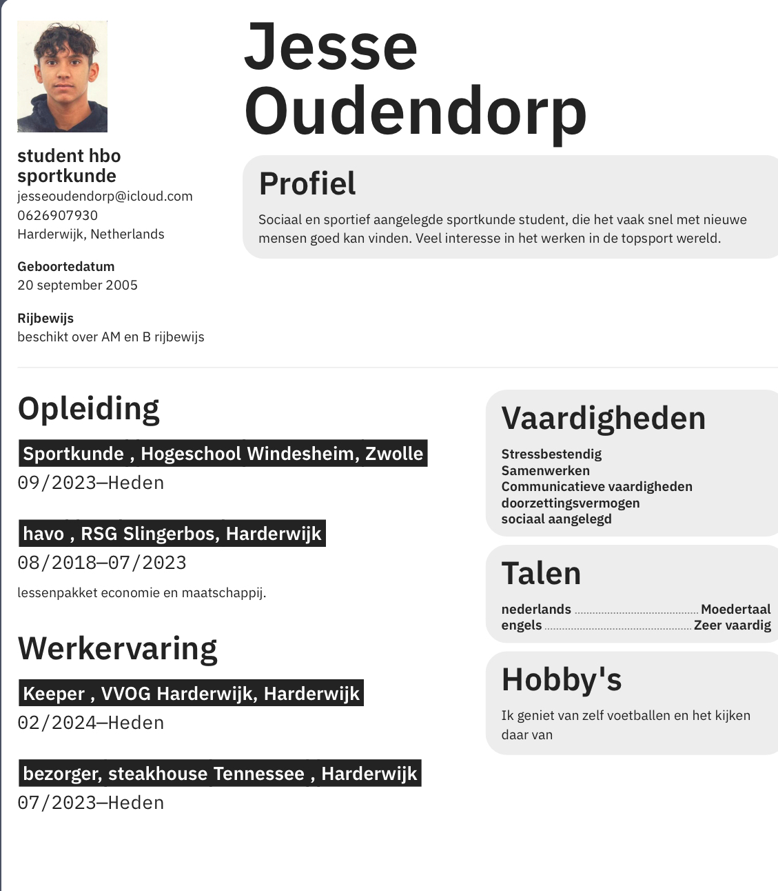 Mijn naam is Jesse Oudendorp, ik ben 19 jaar oud en zit in het tweede jaar van de opleiding Sportkunde aan het Windesheim in Zwolle. Hiervoor heb ik mijn havo-diploma behaald aan het RSG. Ik beschouw mezelf niet als een typische student die bij een studentenvereniging zit en vaak uitgaat. In plaats daarvan zie ik mezelf als een drukke student die naast zijn studie ook tijd besteedt aan sport, werk en familie. Deze aspecten zijn voor mij om verschillende redenen heel belangrijk, en ik wil daar geen van opgeven.